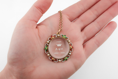 This beautifully preserved late-Victorian memorial pendant features a rock crystal quartz panel engraved “From A & H, 1892–1904,” surmounted by...