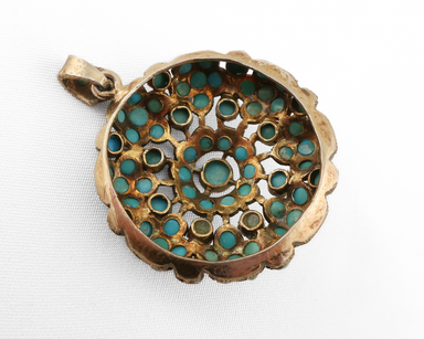 Circa 1870. This striking Victorian pendant is crafted in 9KT gold and set with a sumptuous cluster of natural turquoise cabochons, arranged in a r...