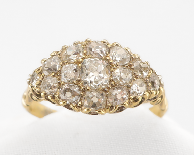 Circa 1870. This stunning 18KT gold Victorian-era ring features a domed cluster design set with 15 old mine-cut diamonds. The diamonds weigh 2.04 c...