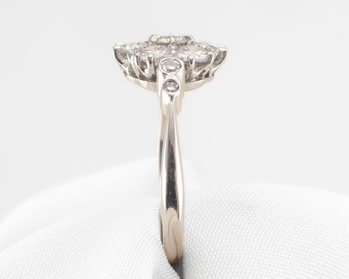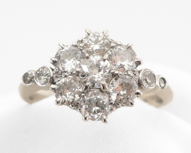 Circa 1930. This gorgeous platinum Art Deco ring features a cluster setting accented with seven prong-set, old European-cut natural diamonds. The r...