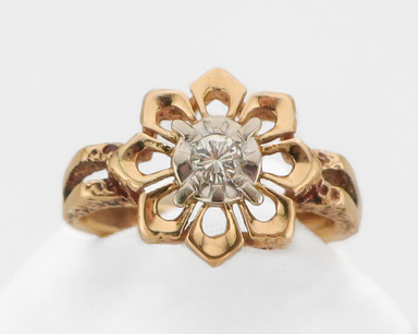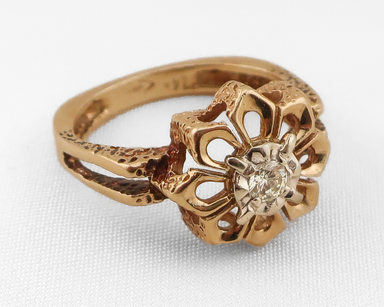 Circa 1970s. This 14KT gold diamond ring features a .17-carat round brilliant-cut diamond set at the center of an openwork, petal-like design. The ...