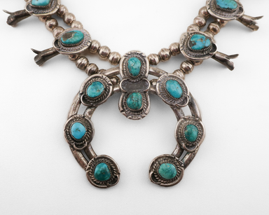 Circa 1940 - 1960. This beautiful midcentury squash blossom necklace is a classic example of traditional Navajo (Diné) silverwork, crafted with a d...