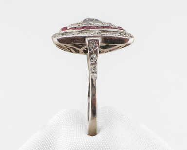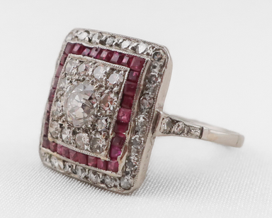 Circa 1930. This platinum Art Deco ring features a square-shaped cluster gallery accented with one bead-set, old European-cut natural diamond, 36 b...