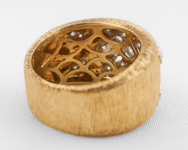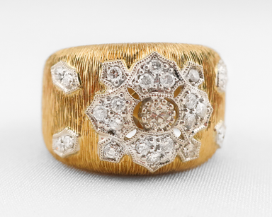 Circa 1980. This gorgeous stunner is crafted in 18KT yellow and white gold and features a domed, wide-band design with a textured yellow-gold surfa...