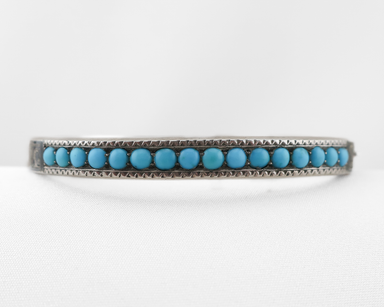 Dating to the early 20th century, this Russian silver bangle features a continuous row of vivid turquoise cabochons set within finely worked silver...