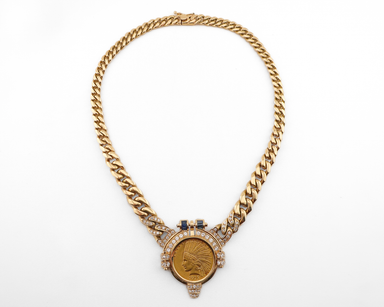 Circa 1980. This fabulous vintage necklace features a United States 10-dollar Indian Head coin dated 1915. The face of the coin depicts Lady Libert...