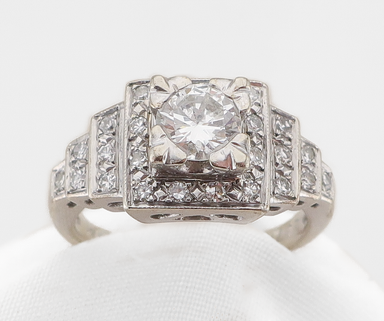 Circa 1930. This fabulous Art Deco ring features a 14KT white gold setting accented with a central .54-carat prong-set, old European-cut natural di...