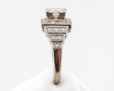 Circa 1930. This beautiful Art Deco engagement ring features a 14KT white gold gallery accented with three old European/transitional brilliant-cut ...