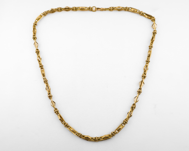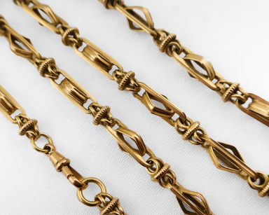 Circa 1870. This stunning Victorian 15KT gold guard chain is composed of alternating elongated oval links and faceted openwork connectors, joined b...