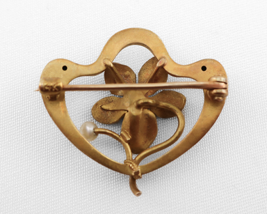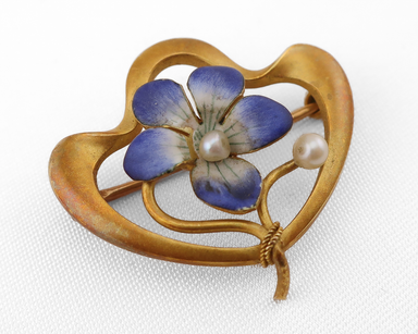 Circa 19. This 14KT gold Art Nouveau brooch features a delicately enameled violet blossom nestled within a softly contoured, openwork heart frame. ...