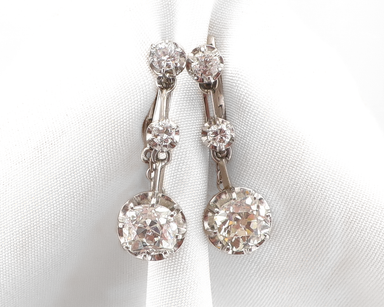 Circa 1920. Each of these gorgeous Art Deco French platinum dangle-style pierced earrings is accented with one old mine-cut natural diamond (2 tota...