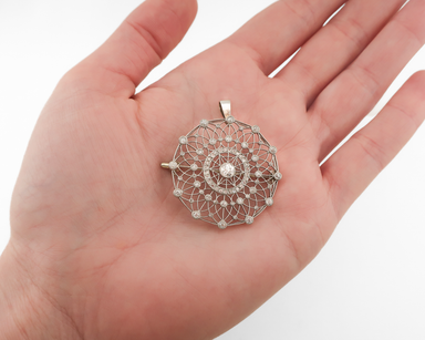Circa 1920. This fabulous French platinum brooch/pendant features Edwardian-style with early Art Deco influence. The intricate platinum openwork de...
