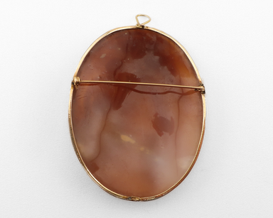 Circa 1900. This captivating midcentury cameo, hand-carved from shell, is framed in a warm 14KT yellow gold bezel. Based on the cameo's iconography...