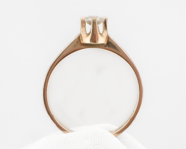 Circa 1970. This classic 14KT gold solitaire ring features a .25-carat round brilliant-cut diamond with SI1 clarity and H color set into an illusio...