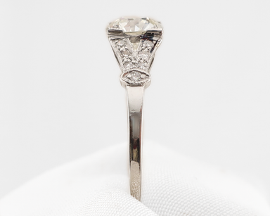 Circa 1930. This gorgeous platinum Art Deco ring features a 1.48-carat old European-cut, prong-set diamond with SI1 clarity and M color. The rin...