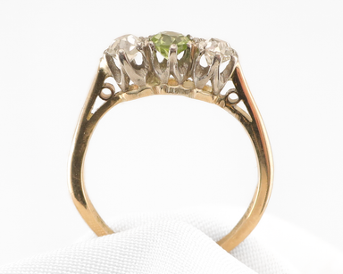 Circa 1910. This beautiful 18KT Edwardian-era, three-stone-style ring features a round, mixed-cut peridot, flanked on either side by an old mine-cu...