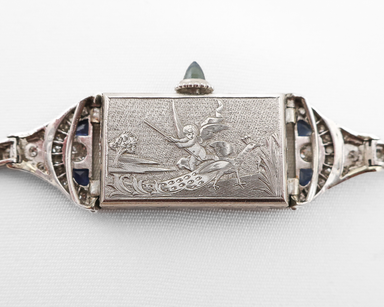 Circa 1930. This stunning Art Deco platinum wristwatch is bordered with milgrain edging. It is accented with two bead-set, round old European-cut d...