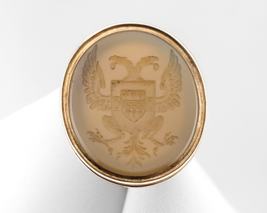 Circa 1800. This exquisite 15KT gold Georgian-era seal fob is carved from softly luminous chalcedony and engraved with a finely detailed heraldic e...