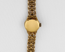 Circa 1950. This gorgeous 18KT Omega watch features a round case with a silver-toned dial, accented with gold-toned hour markers and hands, topped by a faceted acrylic crystal. The case houses an Omega 17 Swiss manual wind movement. The watch is finished with a 7-inch fancy-link bracelet and fold-over clasp. The movement is in working order. Reference number: 11434667 10914