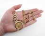 Circa 1980. This fabulous vintage necklace features a United States 10-dollar Indian Head coin dated 1915. The face of the coin depicts Lady Liberty wearing a Native American feathered headdress with the word LIBERTY encircled by 13 stars. The reverse features a bald eagle standing upon a bundle of arrows and an olive branch. The coin is set within an ornate 14KT yellow gold diamond-and-sapphire mounting. The necklace is accented with 76 bead-set, round-brilliant-cut natural diamonds, six channel-set, baguette-cut natural sapphires, and four bezel-set, round mixed-cut natural sapphires. The diamonds weigh 2.51 carats, with VS1-VS2 clarity and G-H color. The sapphires weigh 1.21 carats. The pendant is attached to a 14KT tapered curb-style neck chain measuring 14 inches in length.