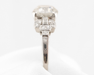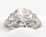 Circa 1920. This lovely Art Deco platinum ring features a 2.81-carat old European-cut diamond with SI2 clarity and J color. The shoulders of the ring are accented with two bezel-set, baguette-cut natural diamonds and 14 bead-set, round single-cut natural diamonds. The accent diamonds total .24 carats, with VS1-I1 clarity and G-I color. The ring is approximately a size 5.25.