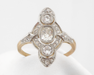Circa 1910. This beautiful Edwardian platinum-topped 14KT yellow gold ring features a pierced design bordered with milgrain edging. The ring features a .47-carat bezel-set, old mine-cut diamond with VS1 clarity and I color. Accenting the center stone are two bezel-set old European-cut diamonds and 24 bead-set round single/rose-cut diamonds. The accent diamonds exhibit VS2-SI2 clarity and G-H color. The ring is approximately a size 9.
