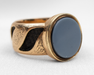 Dated 1868. This 15KT gold Victorian mourning ring features a bezel-set polished oval sardonyx tablet. The shoulders are finely engraved with foliate detailing, while the dark inset panels contain preserved woven hairwork — a traditional 19th-century memorial practice.