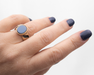 This ring measures 13mm by 14mm at the top. The shank measures 10mm all the way around. The ring is currently a size 7.75. The only possibility to size this ring is to add a sizing shelf.