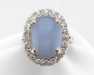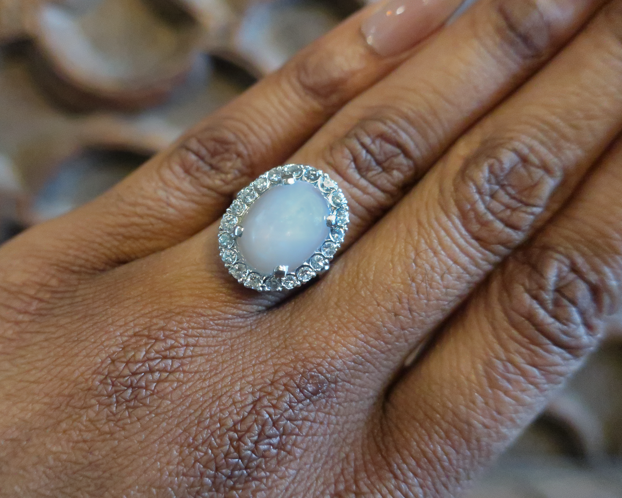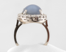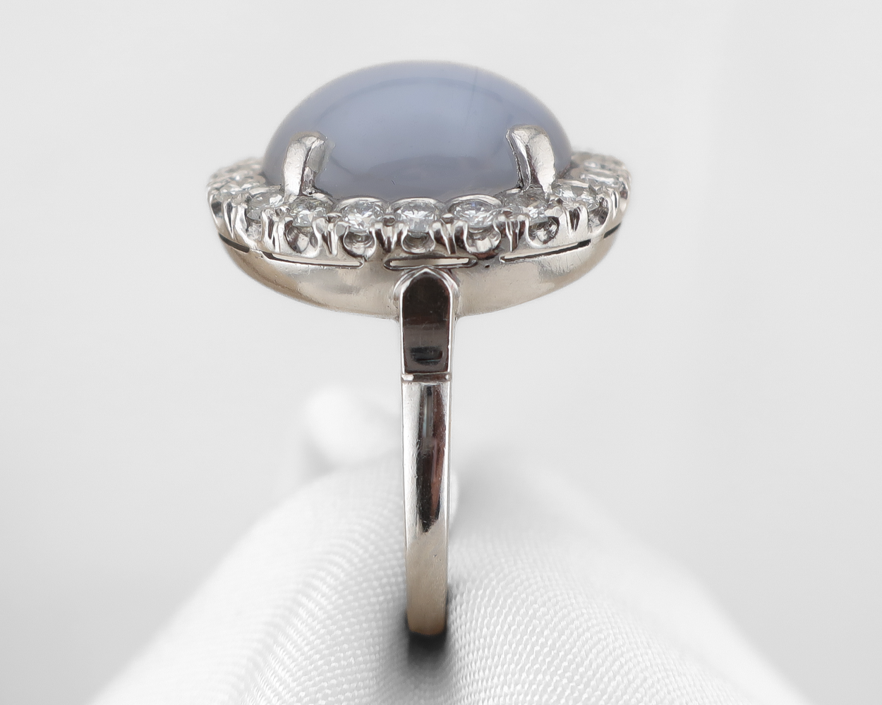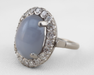 Circa 1950. This gorgeous midcentury ring features a 10.20-carat oval, cabochon-cut natural star sapphire set into a four-prong platinum setting. The sapphire is haloed with 20 round brilliant-cut diamonds, totaling .60 carats, with SI1-SI2 clarity and F-G color.