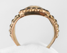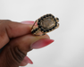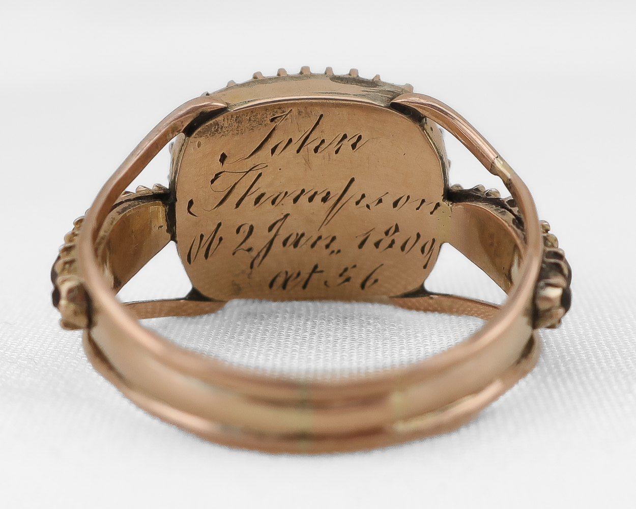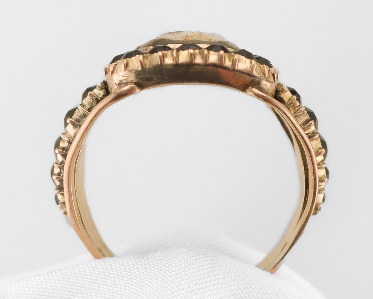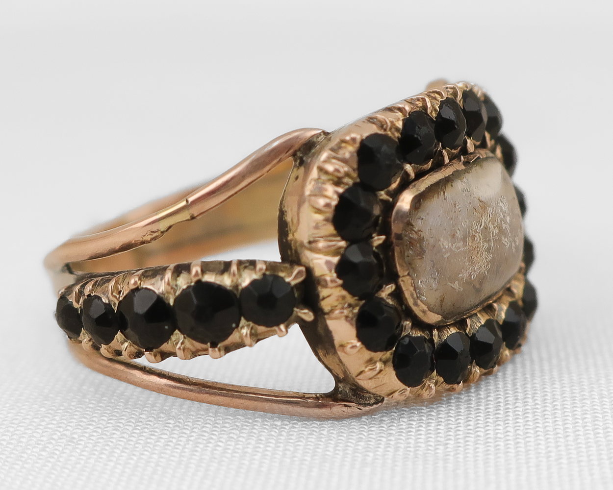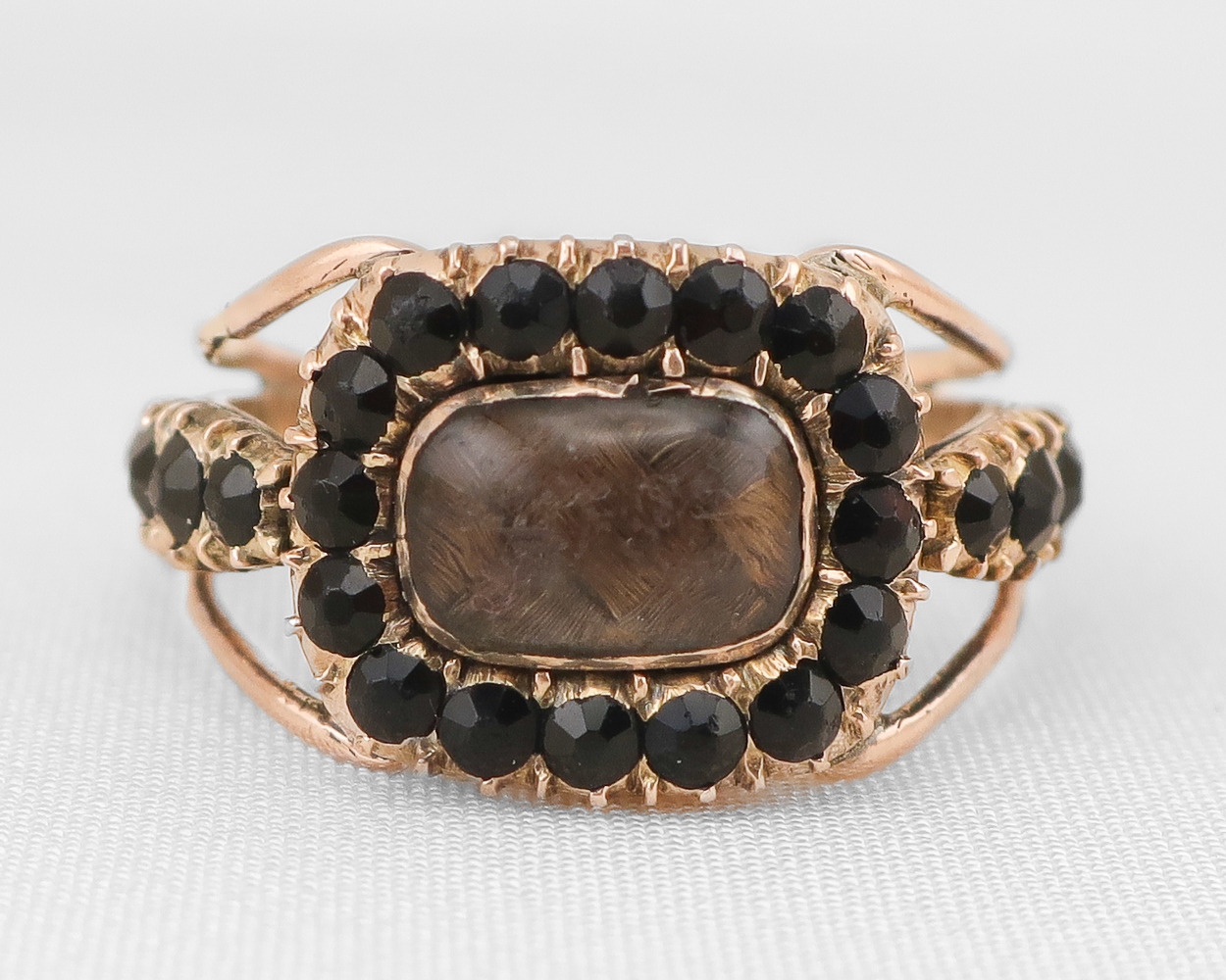 Dated 1809. This sentimental Georgian mourning ring features prong-set pieces of jet set in 9KT gold. In the center of the ring is a lock of braided hair, protected with crystal. Wearing authentic Whitbey jet signified proper mourning etiquette and emotional sincerity in grief. The ring is approximately a size 8.75.