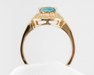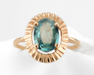 This chic 1970s ring is set with a vibrant 1.43-carat natural blue zircon—exhibiting an exceptional brilliance and lively teal hue. The gem is nestled within a textured 10KT yellow gold halo, its radiating design capturing the era’s bold, modernist spirit, and is signed by the esteemed Canadian jeweler Birks.