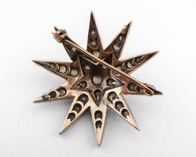 Circa 1870. This lovely Victorian sterling silver-topped 10KT yellow gold brooch/pendant is designed in a radiating starburst motif set with 31 na...