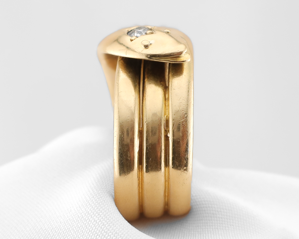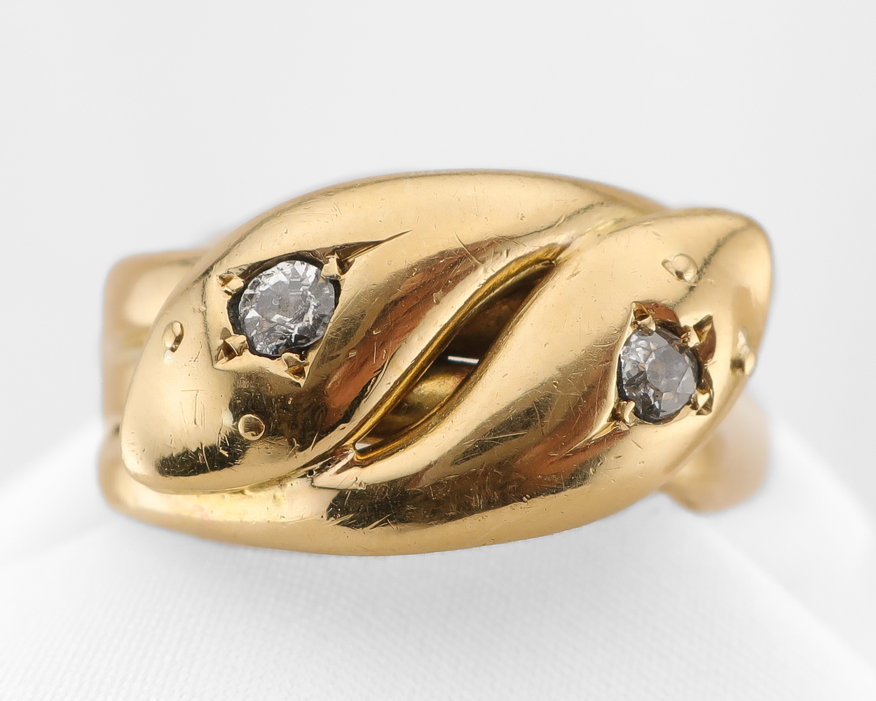 Dated 1912: Chester, England. This gorgeous Edwardian ring features two intertwined 18KT gold snakes, each accented with a bead-set old European-cut diamond. Snake rings were all the rage after Queen Victoria was given a snake engagement ring from Prince Albert, symbolizing eternal love. The ring is approximately a size 10.